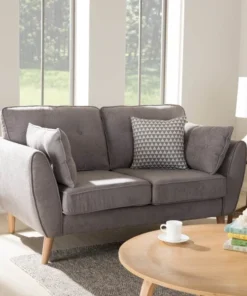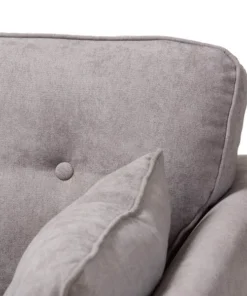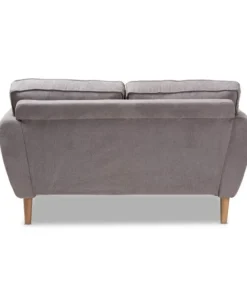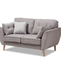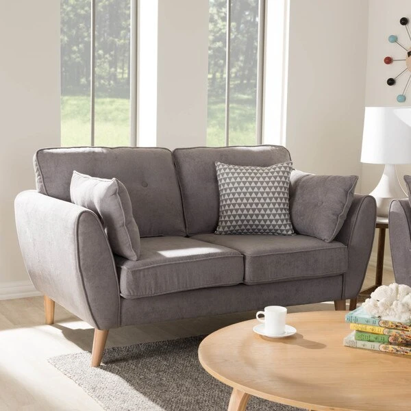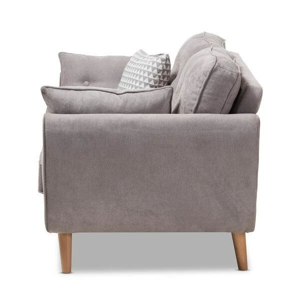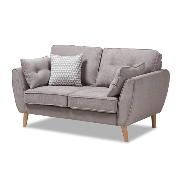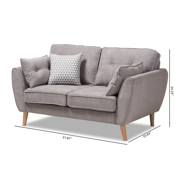 Modern looks never looked so welcoming – sink into the Miranda loveseat. The mid-century modern-inspired design is clear to see in the clean lines and low-profile of the loveseat. The Miranda is upholstered in light grey fabric and rests on smoothly tapered light brown legs. The loveseat features button-tufting on the seat back cushions and delightful piping on almost every visible edge. The Miranda comes with two side pillows and one decorative pillow, and removable cushions for ease of cleaning. It's easy to imagine getting cozy and comfortable on the generously foam-padded Miranda. This loveseat will bring extra charm to your living room or other shared space. The Miranda requires assembly.
