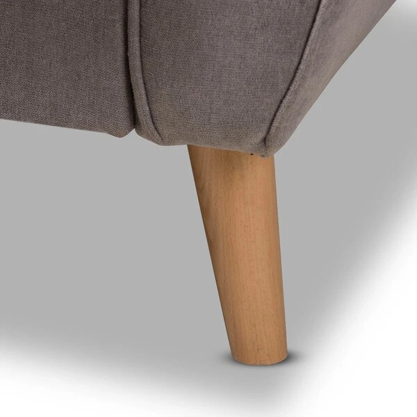 Modern looks never looked so welcoming – sink into the Miranda sofa. The mid-century modern-inspired design is clear to see in the clean lines and low-profile of the sofa. The Miranda is upholstered in light grey fabric and rests on smoothly tapered light brown legs. The sofa features button-tufting on the seat back cushions and delightful piping on almost every visible edge. The Miranda comes with two side pillows and two decorative pillows, and removable cushions for ease of cleaning. It's easy to imagine getting cozy and comfortable on the generously foam-padded Miranda. This sofa will bring extra charm to your living room or other shared space. The Miranda requires assembly.