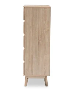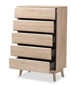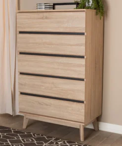 The simplicity and minimalist look of the Miren 5-drawer chest make it a seamless addition to your bedroom or guest room. The sleek silhouette and angled, tapered legs of the chest are hallmarks of its mid-century modern-inspired design. The Miren features an engineered wood frame finished in a light oak brown, with dark grey finishing between the drawers for a subtly contrasting color scheme. The chest's five drawers pull forward from the top on sliders. The Miren's simple-yet-chic look make it easy to coordinate with your existing decor. The under clearance area beneath the chest make it easier to clean underneath it. The Miren requires assembly.