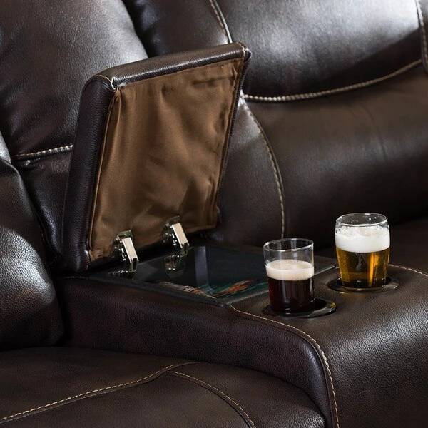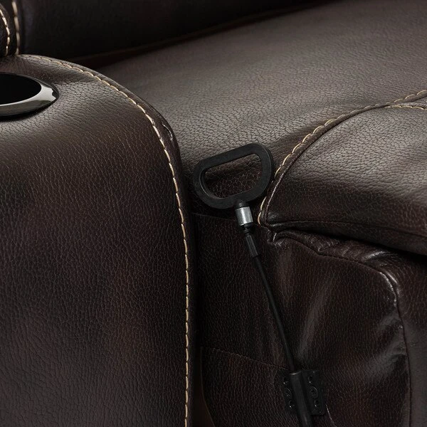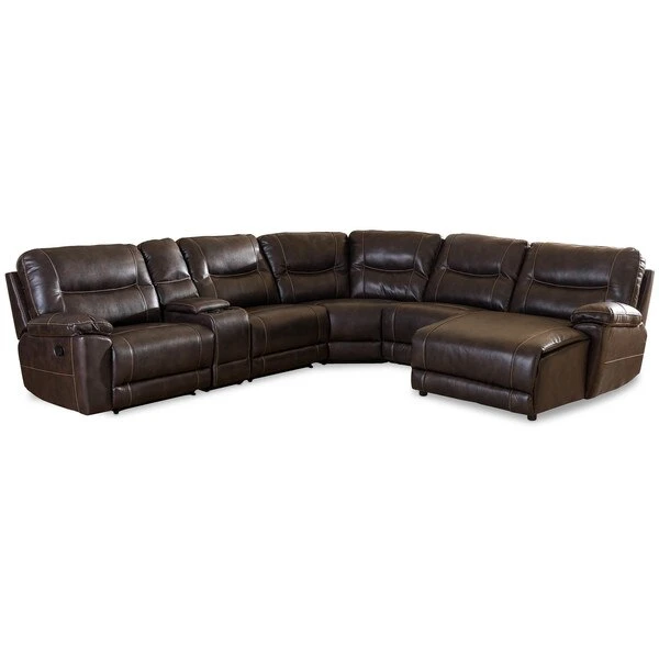 Relax in total comfort with the Mistral 6-Piece Sectional with Recliners Corner Lounge Suite. Constructed of plywood frame, this 6-piece sectional with recliners will provide you and your family a good gathering spot and a total relaxation. Upholstered in dark brown bonded leather, the seat of the set is foam filled and cushioned with pocket spring for ultimate comfort while the back is filled with fiber for extra softness. To ease every day's use, left arm facing chair is completed with trigger-pull on the side to recline while armless recliner relies on the cable pull hidden on the side to recline. The wedge at the corner, armless chair and the console do not recline. Metal brackets allow each piece to be connected. Other than the left arm facing recliner and right arm facing chaise, the rest of the pieces are modular and you could decide on the way to connect them. For ultimate comfort, the back of the chaise could be pushed back for about 45 degree to relax. There's room for everyone to snuggle in for some fun time together with this living room set. White contrast stitching's add more contemporary to the set.