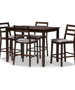 Entertaining is easy with the Nadine pub set. The modern and contemporary-inspired design is clear to see in the tapered legs of the table. The Nadine table and chairs have delightful, walnut finishing. The chairs feature an open chair back design, paired with a light grey fabric upholstered seat. The Nadine is perfect as a dining set for small spaces, or a unique and stylish addition to your dining room, dinette, or breakfast nook. This five piece set includes four chairs and one table, which all come together in one box. The Nadine requires assembly.
