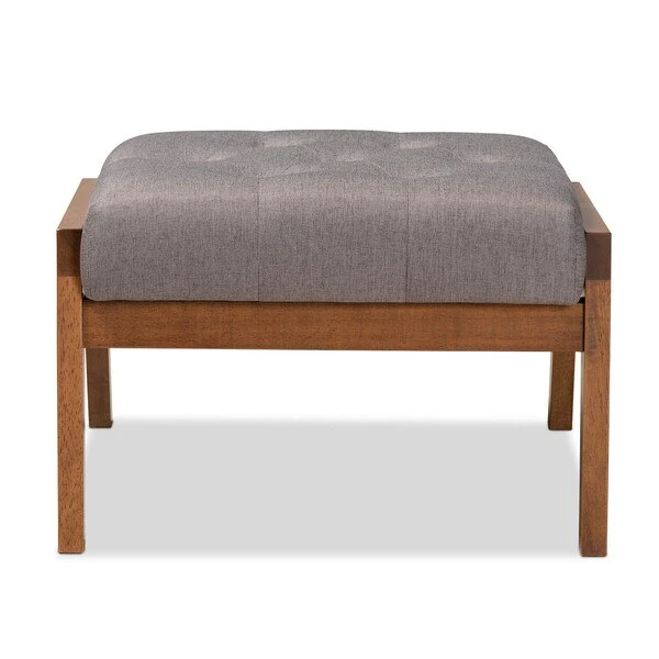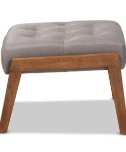 Kick up your feet after a long day with the Naeva footstool. Constructed from wood, the Naeva is upholstered in a soft grey fabric that complements the walnut finish on the wood. Plush foam padding provides ample resting comfort. Inspired by mid-century design, the footstool features a low profile and angled legs. Use this versatile piece as a footrest or as an extra seat. The Naeva footstool requires assembly.