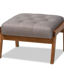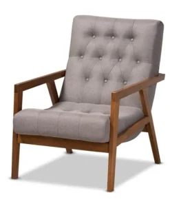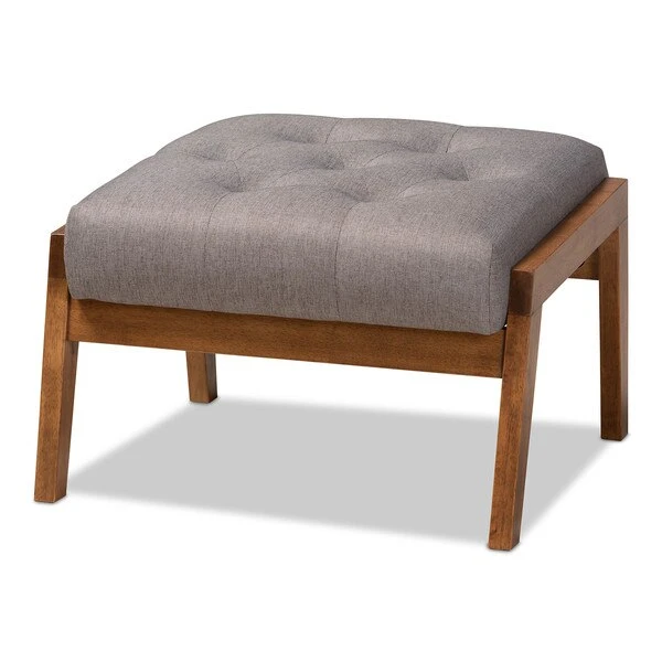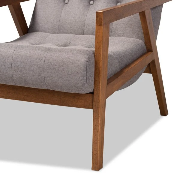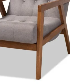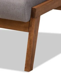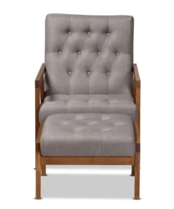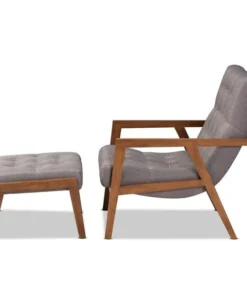 Soft curves are paired with sharp angles to give the Navea armchair and footstool set a cool retro look. Constructed from wood, each piece is upholstered in a soft grey fabric that complements the walnut finish on the wood. Plush foam padding and the deep, curved seat provide ample lounging comfort. Additional comfort is provided by the foam padded stool, which can be used as a footrest or as an extra seat. Inspired by mid-century design, each piece features a low profile and angled legs. The Naeva armchair and footstool set requires assembly.