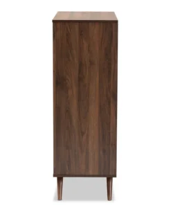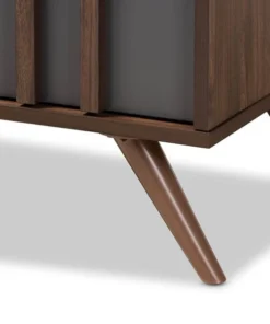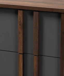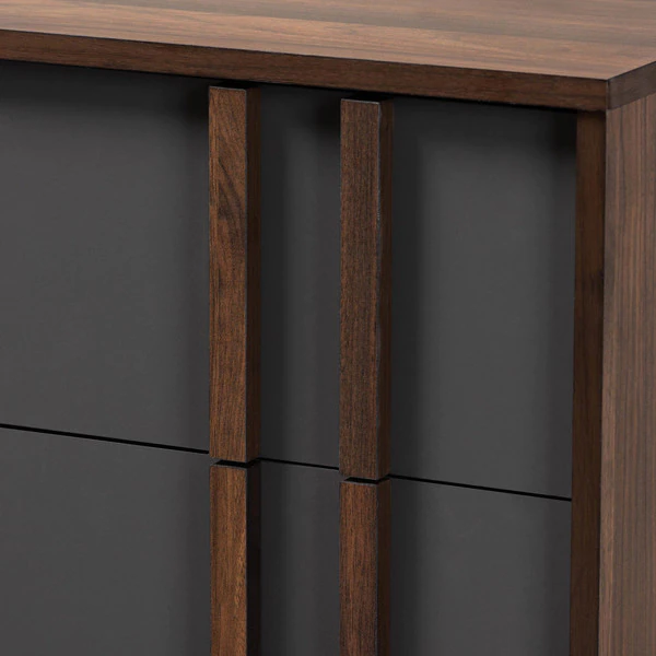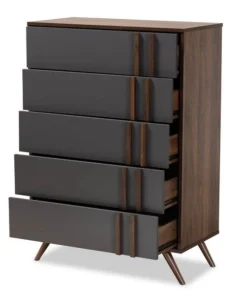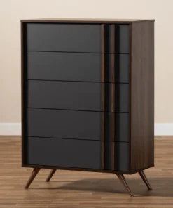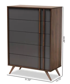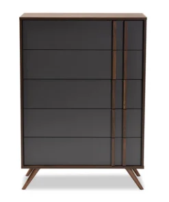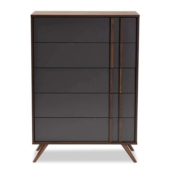With an ultra-modern, two-tone finish and ample storage space, the Naoki chest is sure to make an impression in any space. This wood chest features five spacious drawers to store clothes, linens, and more. Each drawer is fitted with metal glides for smooth movement. A two-tone grey and walnut finish are paired with long, double vertical handles for a cool, contemporary look. Requiring assembly, the Naoki chest is supported by splayed legs that create a chic, retro profile.