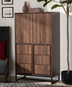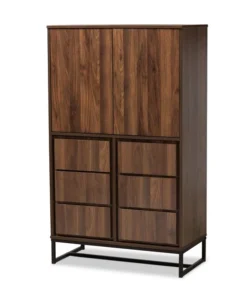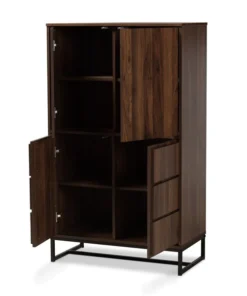 Add spacious storage to any room with the stunning Neil cabinet. Made in Malaysia, the Neil pairs a black finished metal base with walnut brown finished wood for a sleek, modern look. Eight internal shelves, two behind each door, provide ample storage space for clothes, kitchenware, or other various items. Requiring assembly, the lower doors feature raised panels that lend depth and showcase fine craftsmanship. Versatile and contemporary, the Neil cabinet is an excellent addition to the modern home.