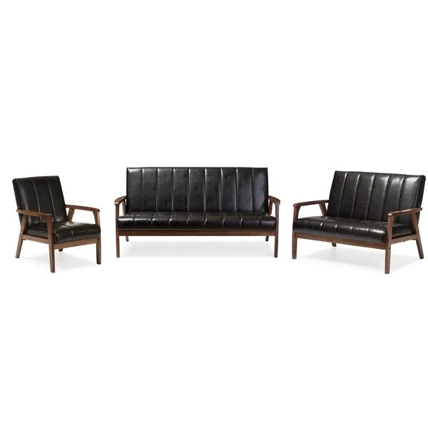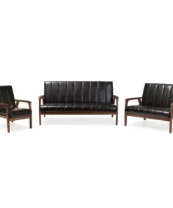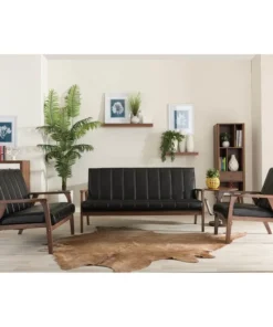 The Nikko is a stunning living room set perfect for modern lounges and receptions. It incorporates the elements of simplicity, style and comfort, wrapping it all into a new and clean silhouette. Made from solid rubberwood, it is purposefully designed for compact everyday use. Upholstered in black faux leather and padded with foam, the Nikko is ideal for the conservatory, kitchen or your living room. Angular wood frame gives a nod to mid-century style, combining Scandinavian design with lux colonial wood in cocoa finishing and complementing the black-toned upholstery for a moody palette steeped in classic masculinity. The Nikko requires assembly.