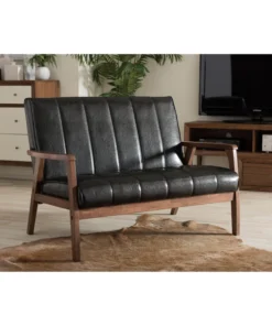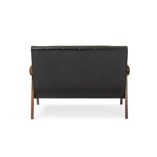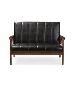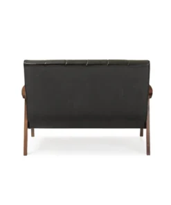The Nikko is a stunning 2-seater loveseat perfect for modern lounges and receptions. It incorporates the elements of simplicity, style and comfort, wrapping it all into a new and clean silhouette. Made from solid rubberwood, it is purposefully designed for compact everyday use. Upholstered in black faux leather and padded with foam, the Nikko is ideal for the conservatory, kitchen or your living room. Angular wood frame gives a nod to mid-century style, combining Scandinavian design with lux colonial wood in cocoa finishing and complementing the black-toned upholstery for a moody palette steeped in classic masculinity. The Nikko requires assembly.