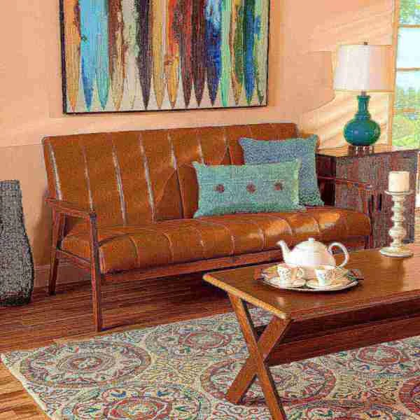 The Nikko sofa is a stunning and eye-catching piece perfect for adding personality to any space. Made in Malaysia, the Nikko is constructed from sturdy wood padded with soft foam and upholstered in smooth, tan-colored faux leather. The angular frame showcases warm walnut tones and features long legs that form ergonomic armrests. Requiring assembly, sleek channel tufting provides unique visual charm while ensuring plush comfort that lasts. With a nod to mid-century design, the Nikko sofa is an ideal accent piece for the modern home.