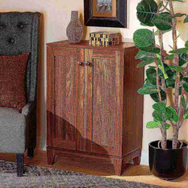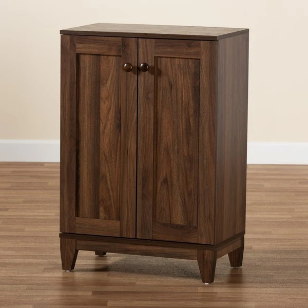 Add sleek, contemporary storage to your entryway with the stunning Nissa shoe cabinet. Made in Malaysia, the Nissa is comprised of sturdy wood showcasing a warm walnut brown finish. The Nissa is equipped with three internal shelves, providing space for around nine pairs of shoes, depending on size. Smooth, round knobs provide easy access. Requiring assembly, inset paneling on the doors lend depth and elegance. Organize your home with the handy and striking Nissa shoe cabinet.