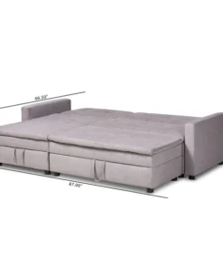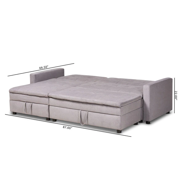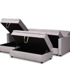 The Noa sofa functions as a sofa, bed, and storage all in one. This living room set consists of a loveseat, chaise, and ottoman, each fitted with a lift-top that reveals ample storage space for extra pillows and blankets. During the day, the Noa is a cozy place to lounge and watch TV. At night, push the ottoman next the chaise and fold down the backs of the chaise and loveseat to create a comfortable bed for overnight guests. Constructed from wood, the Noa is upholstered in a soft, grey polyester fabric that complements a wide range of interior color palettes. Plush foam-padded cushions provide comfort when lounging or sleeping. Biscuit tufting adds a chic, modern look. The Noa sofa requires assembly.