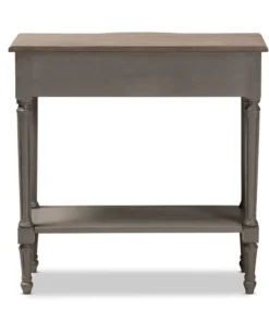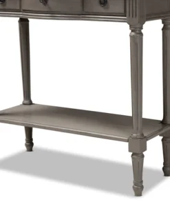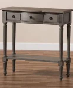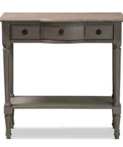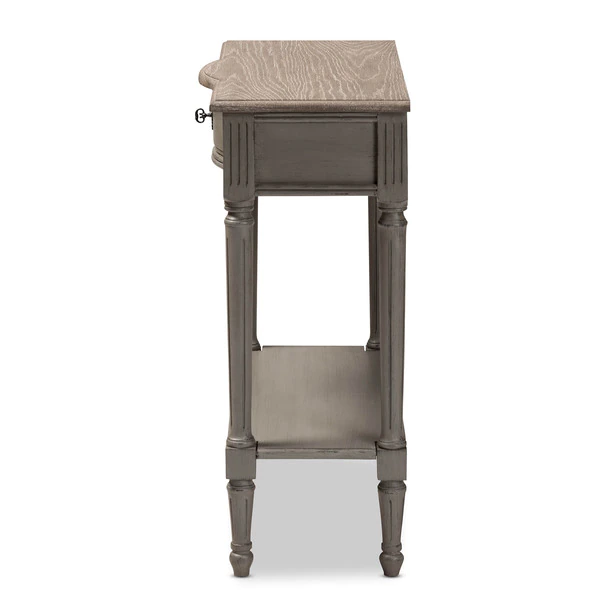 Featuring an intricately carved frame and aged finish, the Noelle console table adds antique French charm to any space. One drawer and one open shelf provide space to display books, candles, and other housewares. The tabletop is made of MDF wood and oak with a white-streaked natural veneer that complements the distressed grey finish on the drawer and legs. Engraved antique silver metal drawer pulls add a refined touch. The Noelle console table requires assembly.