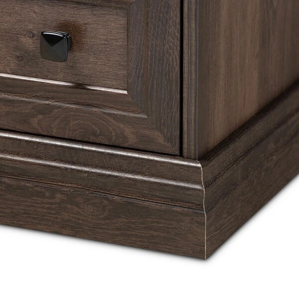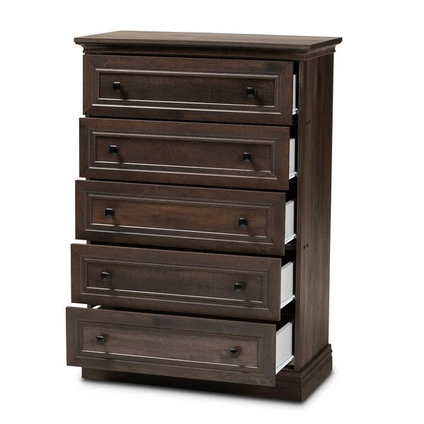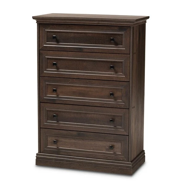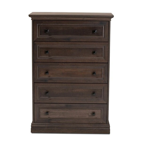Establish an elegant aesthetic in your bedroom with the Nolan chest. Constructed from wood, the Nolan features five spacious drawers with ample space to store clothes, undergarments, and more. Its handsome hazel walnut finish and paneling give the piece a classic look that’s always in style, while black square knobs lend a modern touch. Pair this chest with the Nolan nightstand to complete the look. The Nolan chest requires assembly.