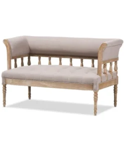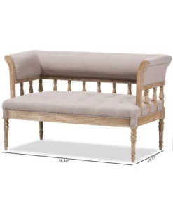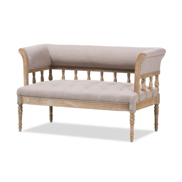 A modern update to the classically designed European settee, the Nora upholstered sofa settee features weathered oak frame with classical details. The settee displays lovely flower carvings from the oak wood. Spindle back and sides supporting the upholstered panels in beige linen fabric. Silver nail heads trim along the edges on back and front of the settee for an elegant look. Place the sofa settee at your entryway way or living room, the Nora settee creates a graceful and majestic seating place your special guest and loved ones alike.The sofa settee is fully assembled.