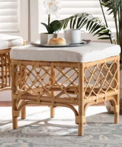 Baxton Studio Orchard Modern Bohemian White Fabric Upholstered and Natural Brown Rattan Ottoman