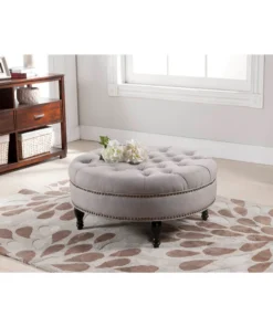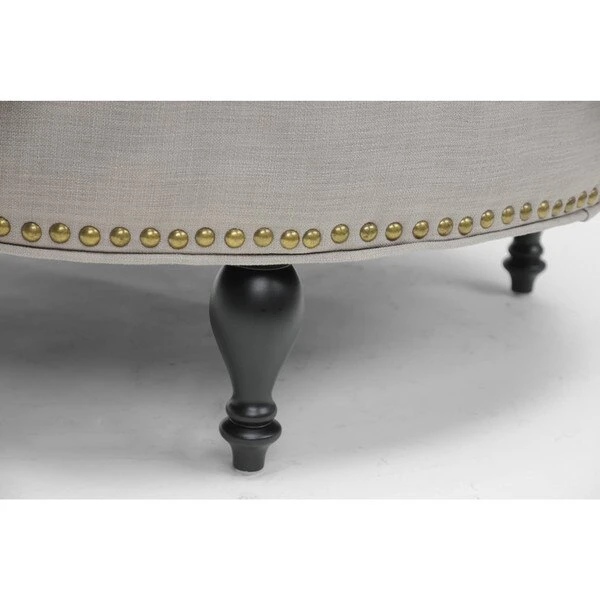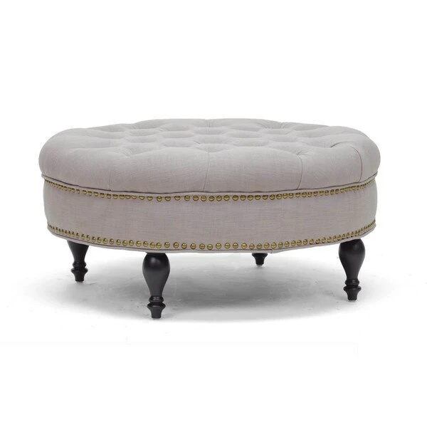 With sumptuous button tufting and black turned wood legs, the Palfrey Upholstered Ottoman instantly augments the elegance of your interior. This stunning modern ottoman is made with durable eucalyptus wood for its frame, firm foam cushioning, and beige linen upholstery. Antiqued brass upholstery tacks line the sides. The Palfrey Round Ottoman requires minor assembly and should be spot cleaned as needed. This style is also available in dark gray (sold separately). 35.25"W x 36"D x 16.75"H