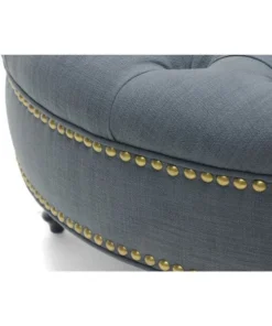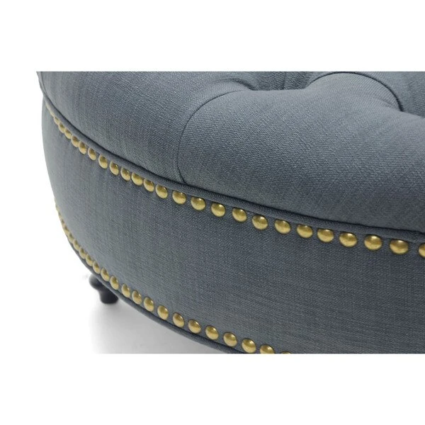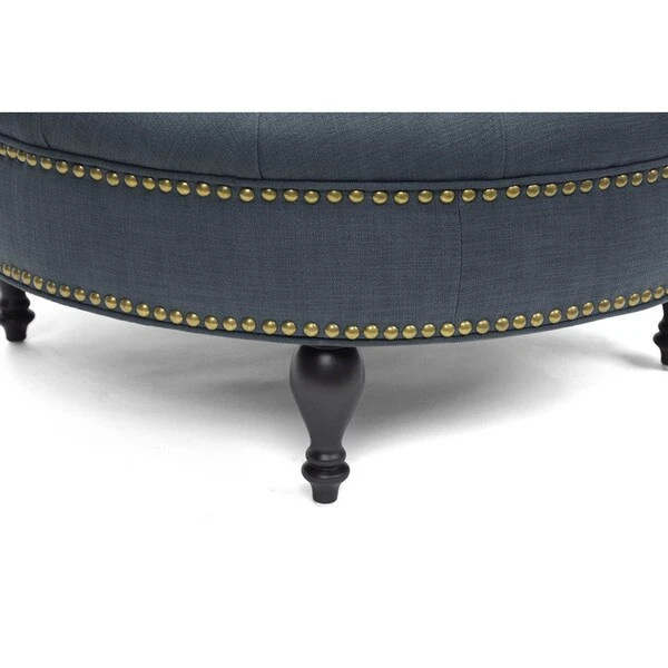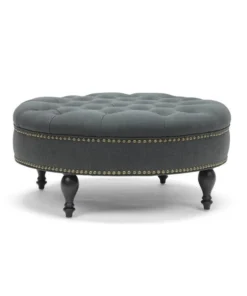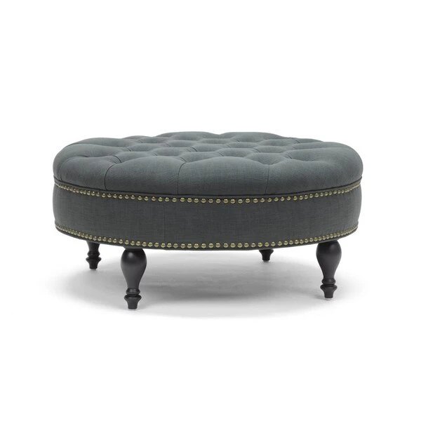 With sumptuous button tufting and black turned wood legs, the Palfrey Upholstered Ottoman instantly augments the elegance of your interior. This stunning modern ottoman is made with durable eucalyptus wood for its frame, firm foam cushioning, and dark slate gray linen upholstery. Antiqued brass upholstery tacks line the sides. The Palfrey Round Ottoman requires minor assembly and should be spot cleaned as needed. This style is also available in beige (sold separately). 35.25"W x 36"D x 16.75"H