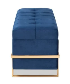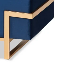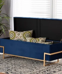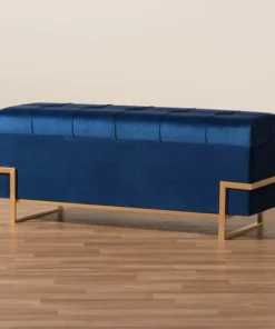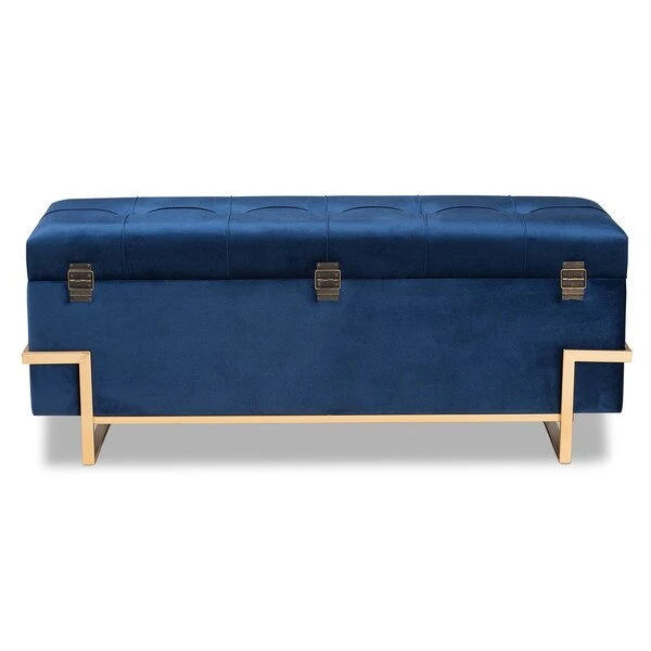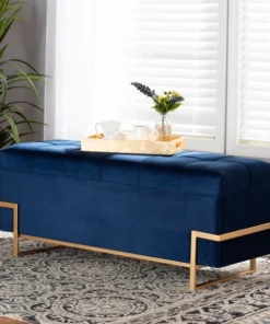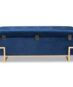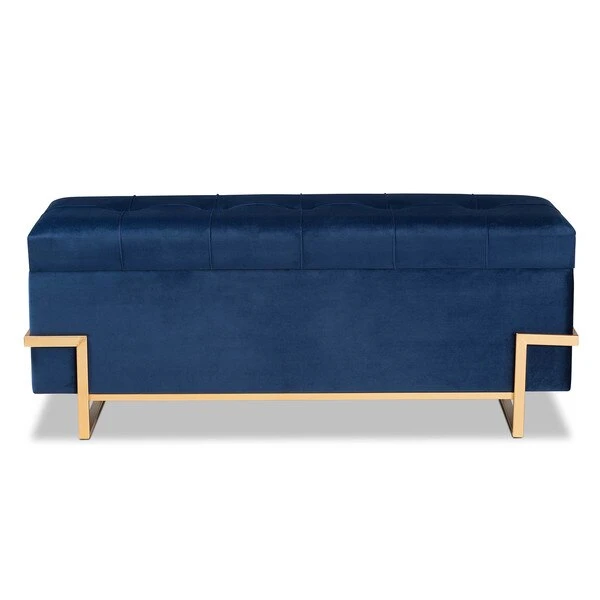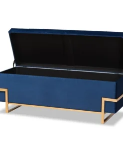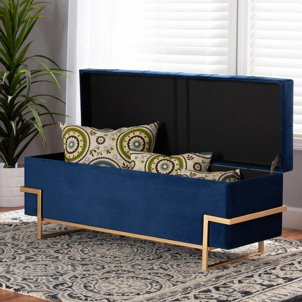 Upgrade your space with the glamorous seating and practical storage offered by the Parker storage ottoman. The Parker is comprised of a sturdy wood frame padded with foam and upholstered in smooth navy blue velvet fabric. The cushioned lift-top seat opens to reveal ample storage space, perfect for the living room or as a bed end accent. Fully assembled, the Parker rests on a chic gold finished metal base that lends the piece an eye-catching aesthetic. Extensive storage space, along with comfortable seating, distinguishes the Parker storage ottoman as a fantastic upgrade to the modern home.