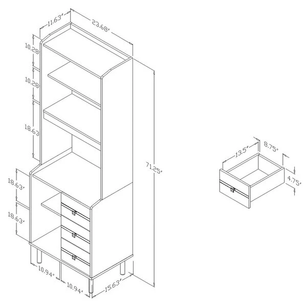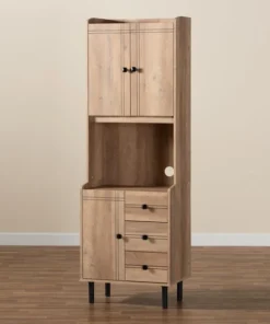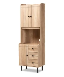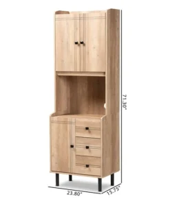 Expand your kitchen with the ergonomic and convenient design of the Patterson kitchen cabinet. Made in Malaysia, the Patterson is comprised of a sturdy wood frame displaying a natural oak brown finish. Three drawers and four internal shelves provide spacious storage for all your kitchen essentials. Requiring assembly, the cabinet features an open shelf fitted with a circular cut-out on its back for easy cord management of kitchen appliances. Square black knobs and rounded black legs lend a modern touch, making the Patterson kitchen cabinet an exceptional addition to the modern home.