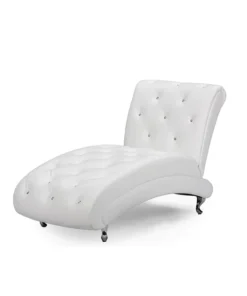Extend your legs in comfort on this elegant chaise lounge. This Pease cotemporary white leather upholstered and crystal tufted chaise lounge features white faux leather upholstery and faux crystal buttons tufting that lends itself well to a variety of decor.