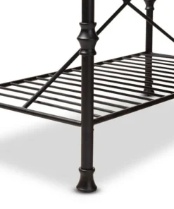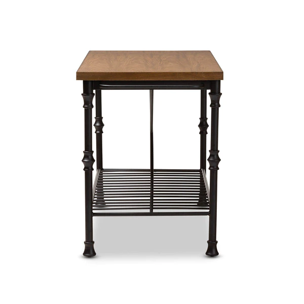 Make efficient use of your kitchen space with the Perin kitchen island table. Constructed from sturdy dark bronze-finished metal, the Perin features a MDF wood tabletop in a distressed ash veneer finish for elegant contrast. This handy table is equipped with a spacious tabletop that can be used to eat meals on, serve dinner guests, or store kitchen items. The Perin is also fitted with two towel holders and a bottom rack that provides storage space for pots, pans, and more. Inspired by industrial design, the table features with a crisscross stretcher for both structural support and visual interest. Striking attention to detail is displayed in the stunning moldings that adorn the frame. Use this versatile table as a kitchen island or add a few bar stools for use as a dining table. The Perin kitchen island table requires assembly.