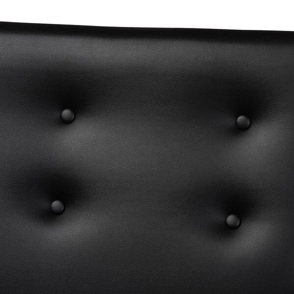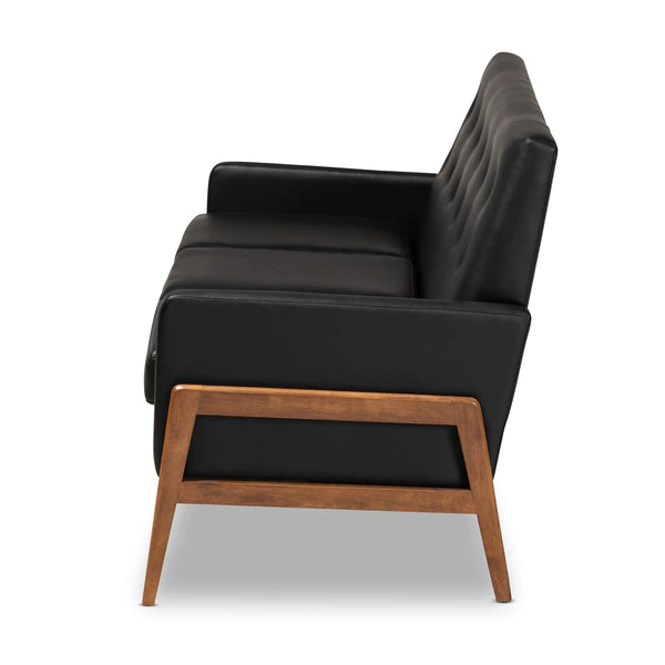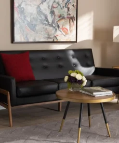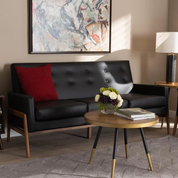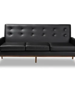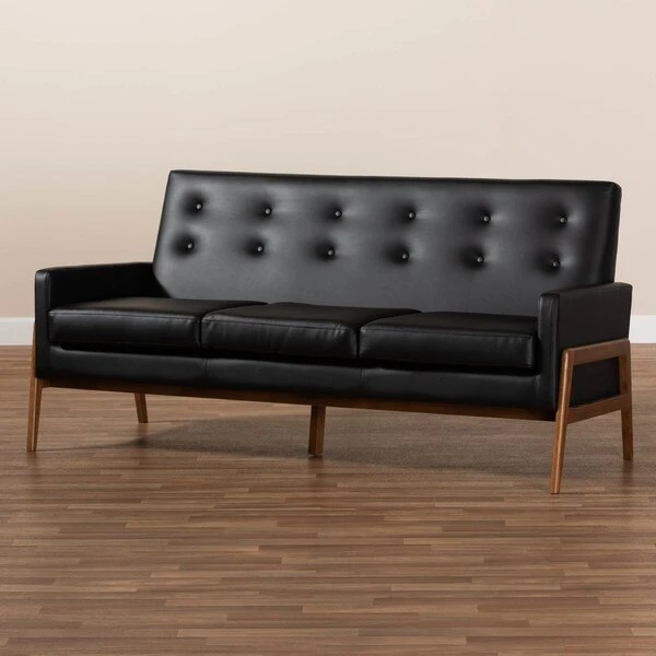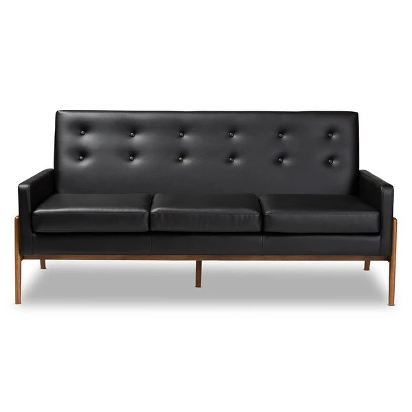 Add modern and comfortable seating to your space with the Perris sofa. Constructed from solid rubberwood, the Perris showcases clean lines and a low profile. Black faux leather upholstery provides a sleek look that complements the warm walnut brown finish on the frame. Wide, plush cushions provide ample seating comfort, while button tufting and angled legs lend a cool, retro look. Stylish and versatile, this sofa is well suited for both private living spaces and public reception areas. The Perris sofa requires assembly.