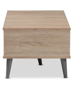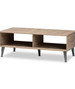 Add simplicity and style to your livingroom with the Pierre coffee table. The clean colors and angled, tapered legs of the table are clear hallmarks of its mid-century modern-inspired design. The Pierre's engineered wood frame is finished in a delightful oak and light grey two-tone color palette. The table features two open shelf spaces with a central divider, giving you many possibilities for storage and display of magazines, books, and decor. The Pierre's under clearance area makes it easy to clean underneath and around the table, making it a practical addition to your home. The color and minimalist design of the table make it easy to coordinate with your existing decor. The Pierre requires assembly.