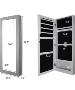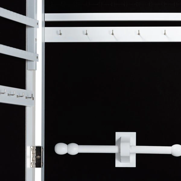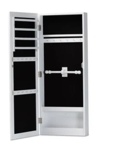 Jewelry organization is made easy with the efficient Pontus jewelry armoire. Made in China, this armoire is constructed from sturdy wood. The door is fitted with a full-length mirror that opens to reveal necklace and bracelet hooks, two shelves, ring compression folds, earring holders, and one hanger rod. Requiring assembly, the Pontus is wall-mountable to maximize floor space while providing convenient jewelry storage. An exceptional tool to organize your collection, the Pontus jewelry armoire elevates the modern home.