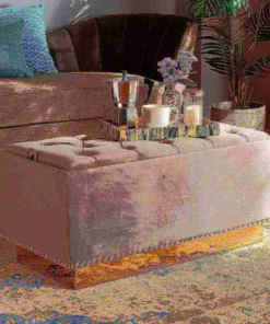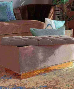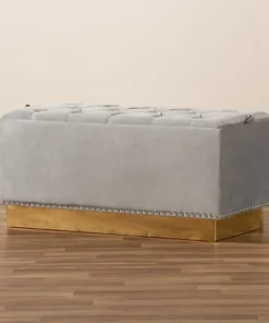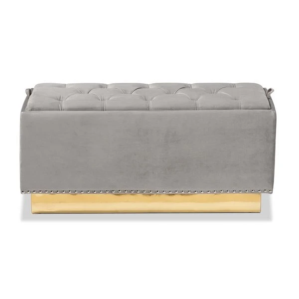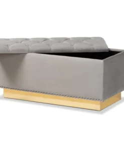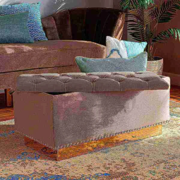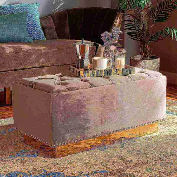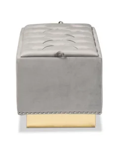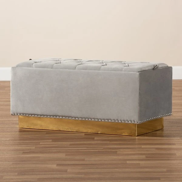 Add versatility and glamorous appeal to any space with the Powell ottoman. Made in China, the Powell is comprised of a sturdy wood frame padded with soft foam and upholstered in smooth velvet fabric. Its removable top reveals valuable storage space to keep items nearby while managing clutter. Button tufting adds a touch of elegance, while silver studs lend contemporary appeal. Fully assembled, the ottoman features a gold-tone PU leather base for added glamour. Use the versatile Powell ottoman as a footstool, storage compartment, and as extra seating.