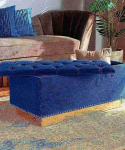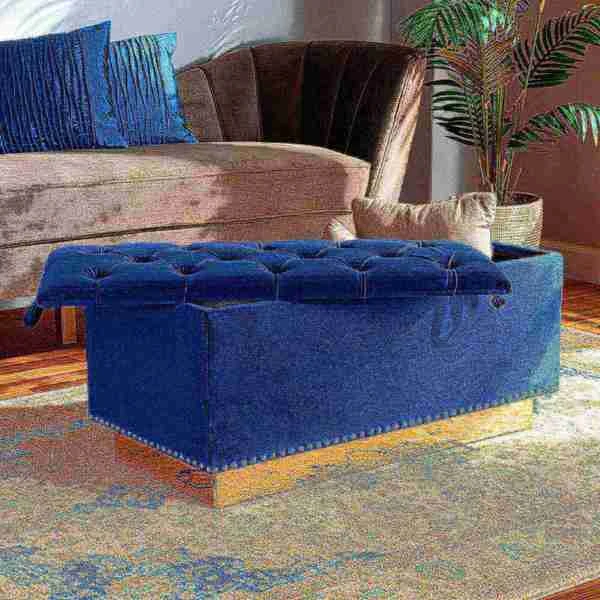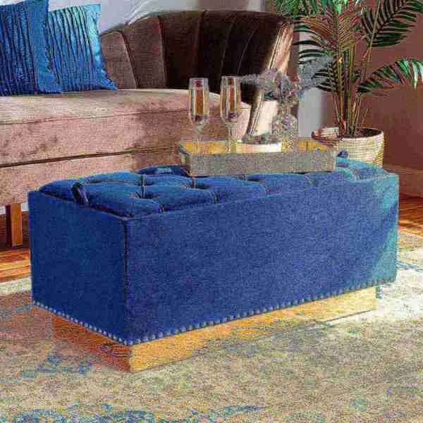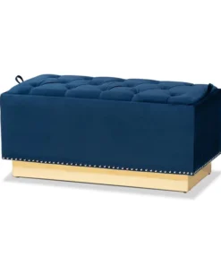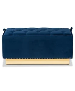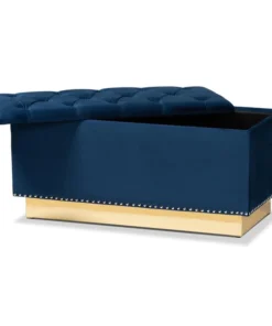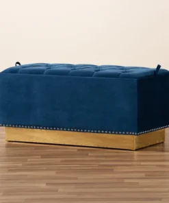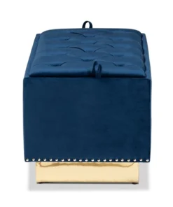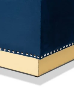 Add versatility and glamorous appeal to any space with the Powell ottoman. Made in China, the Powell is constructed from a sturdy wood frame that is padded with soft foam and upholstered in smooth velvet fabric. The Powell requires assembly and features a removable lid that reveals valuable storage space to keep items nearby while managing clutter. A striking brushed-gold finish on the base adds a touch of luxurious style and is complemented by chic button tufting. Use the versatile Powell ottoman as a footstool, storage compartment, and as extra seating.