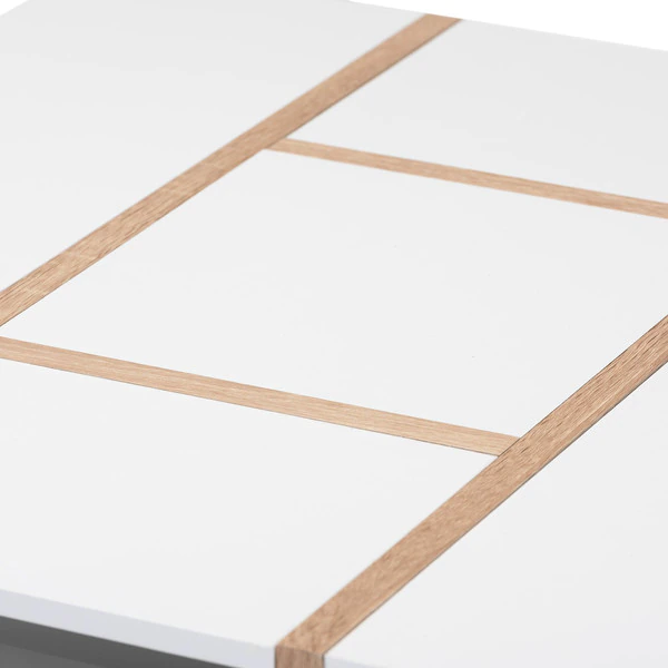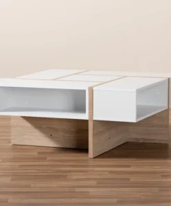 Anchor your living room in modern style with the Rasa coffee table. Panels of oak-tone wood intersect a sleek white square, resulting in a striking geometric design. This wood coffee table features a spacious tabletop, ideal for displaying your large magazine collection and a few potted plants. Open compartments on all four sides of the table provide additional display space. The Rasa coffee table requires assembly.