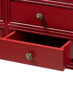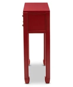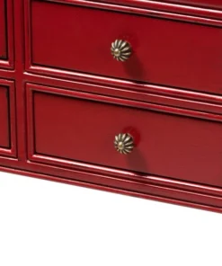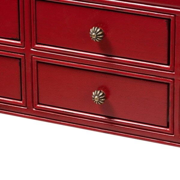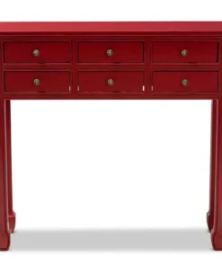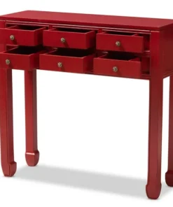 Add some old world charm to your home with the Pomme console table. The classic and antique-inspired design comes through in the curves and ornamentation of the table. The Pomme's sturdy Bayur wood frame is finished all over in a unique red color, making this an incredible statement piece. The table features six drawers, all with detailed bronze-finished handles. The international influences in the table's design make it easy to coordinate with a wide range of decor, including bohemian and contemporary looks. The Pomme is sure to be a conversation starter, perfect for displaying and adding storage in your entryway, hallway, or mudroom. The table requires assembly.