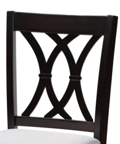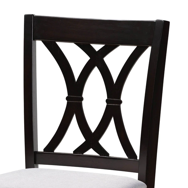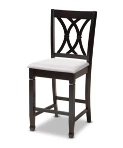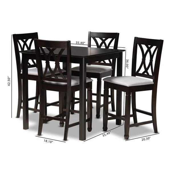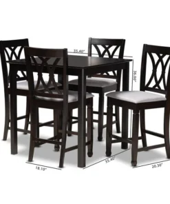 Exquisitely crafted, the Reneau 5-piece pub set adds elegance to any dining space. Constructed from wood, this pub set includes one table and four chairs, each upholstered in a light polyester fabric that complements the rich espresso wood finish. Designed with both comfort and style in mind, each chair features a plush foam-padded seat, as well as an exquisite cut-out design on its back. Tapered feet add a classic, refined touch. The compact size of the Reneau set makes it well suited for dining rooms and kitchens with limited space. The Reneau 5-piece pub set requires assembly.