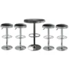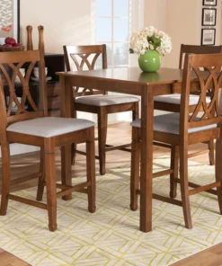 Exquisitely crafted, the Reneau pub set adds elegance to any dining space. This wooden pub set includes one table and four chairs, each upholstered in a light fabric that complements the walnut brown finish on the wood. Designed with both comfort and style in mind, each chair features a plush foam-padded seat, as well as an exquisite cut-out design on its back. Tapered feet add a classic, refined touch. Requiring assembly, this compact dining set is well suited for dining rooms and kitchens with limited space.
