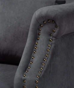 Rest and unwind with the sumptuous comfort of the Renessa armchair. Made in China, this chair is comprised of a sturdy wood frame padded with layers of plush foam and upholstered in rich velvet fabric. Button tufted accents produce an air of elegance while a nail head trim outlines the curled arms of the chair with contemporary glamour. Ring-turned legs add a touch of grace, making the Renessa armchair a sophisticated addition to any space.