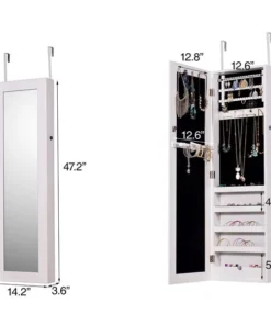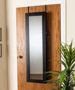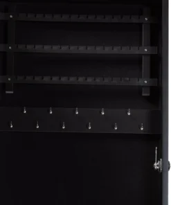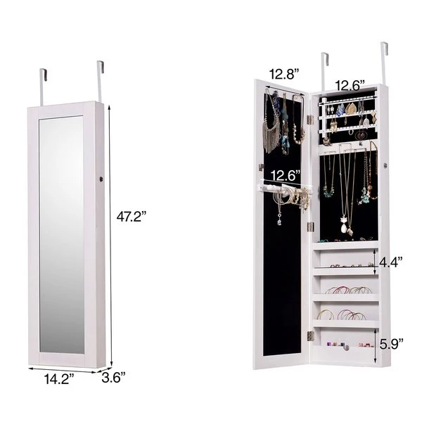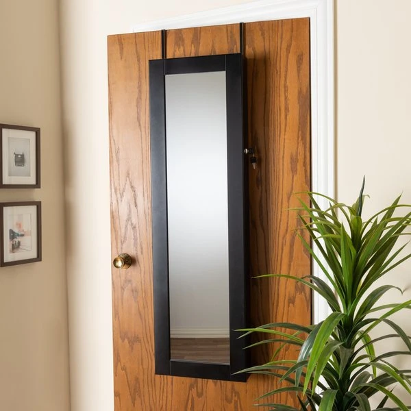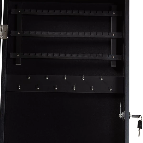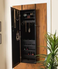 Discreetly arrange your jewelry all in one place with the elegant versatility of the Richelle jewelry armoire. Made in China, this armoire is constructed from sturdy wood. The door features a secure lock that opens to reveal necklace and bracelet hooks, three shelves, ring compression folds, earring holders, and one hanger rod. Requiring assembly, the Richelle can either be hung over the door, or mounted to the wall, to maximize floor space while providing convenient jewelry storage. A seamless and effective solution to your storage needs, the Richelle jewelry armoire gracefully organizes your collection.