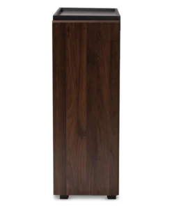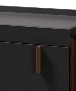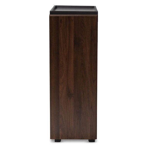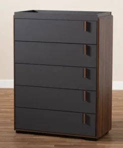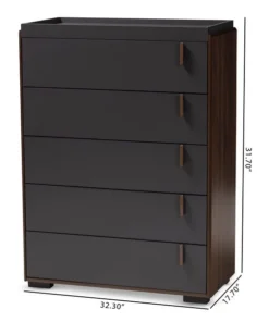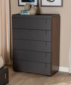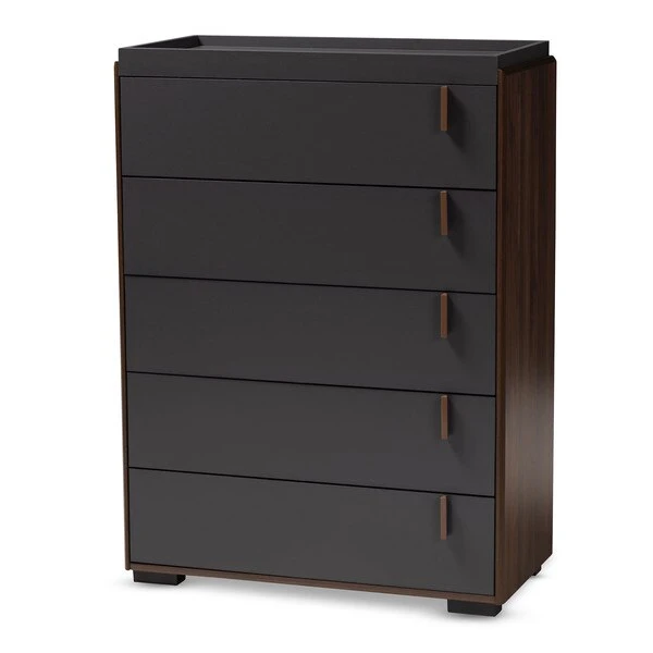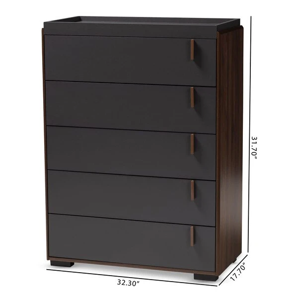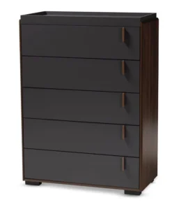 Keep your bedroom organized with the Rikke chest. Constructed from solid particle board, the Rikke features a two-tone grey and walnut brown finish for a cool, contemporary feel. Five spacious drawers provide room to store clothes, linens, and more. Each drawer is fitted with metal glides for smooth movement. Long, vertical brown PVC drawer handles add a sleek touch. Pair this stylish chest with the other bedroom pieces in the Rikke collection to complete the look. The Rikke chest requires assembly.
