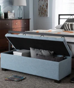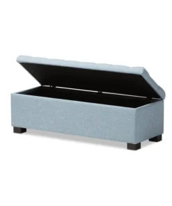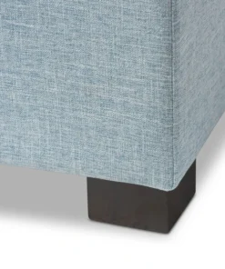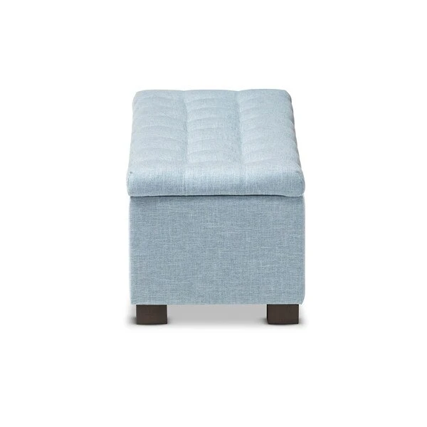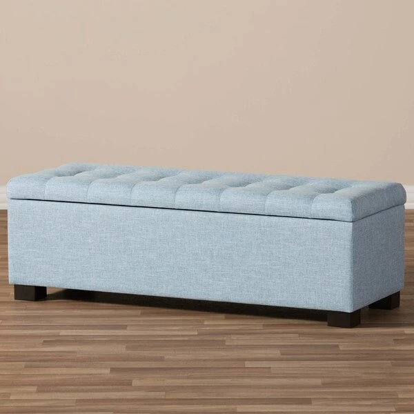 Perfect as a bed end bench for your bedroom or as an accent piece in your living space, the Roanoke storage ottoman bench combines handy seating and storage in a stylish way. Constructed of solid rubberwood frame, the storage ottoman bench features cushioned seat upholstered in quality polyester blend fabric that's durable and stain-resistant, available in your choice of beige, greyish beige, dark grey or light blue color for a neutral or statement look. Featuring grid-tufting design, the hinged top reveals spacious storage trunk while the black solid wood legs create a strong foundation and an elegant look. The Roanoke storage ottoman requires minor legs assembly.
