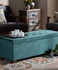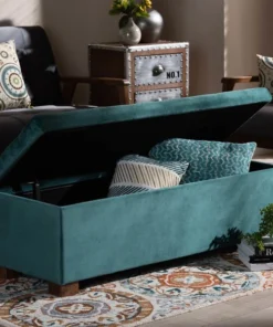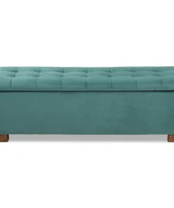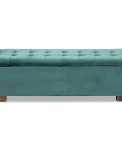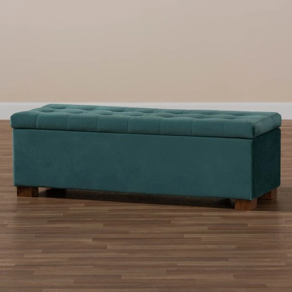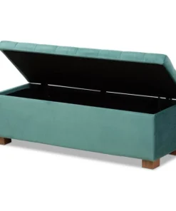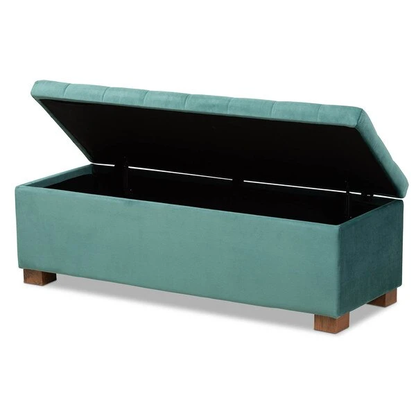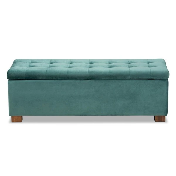 Perfect as a bed end bench for your bedroom or as an accent piece in your living space, the Roanoke storage bench combines handy seating and storage in a stylish way. Constructed solid rubberwood, the bench features a cushioned seat upholstered in a soft velvet fabric that adds a dose of glamour to your space. The elegant grid-tufted top opens to reveal ample storage space, while walnut brown legs create a strong foundation. The Roanoke storage bench requires leg assembly.