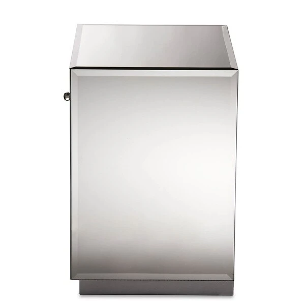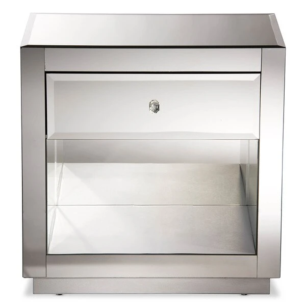 The Rochadh Mirrored nightstand is totally stunning. The completely mirrored finish gives this piece the decadent look of a bygone era; whilst at the same time it has modern touches for the modern home. The mirrored one-drawer and one open shelf unit is a functional piece of furniture that can be used throughout the home. There is no doubt it would look beautiful beside any bed, but would not look out of place in a lounge or large living as a side table. Wherever it is placed you can be sure it will dazzle with beauty. Featuring Hollywood glamour style, it has beveled edges and contemporary lines. Handcrafted of wood composite, mirrored glass and mirrored laminate throughout, this piece is elegant and classy. One spacious drawer and an open shelf line the front with drawer fitted with contemporary silver knob, providing an understated look while making the it accessible. The mirrored finish will catch the light beautifully and create a glamorous, sparkling look in your bedroom. The Rochadt nightstand will arrive fully assembled.