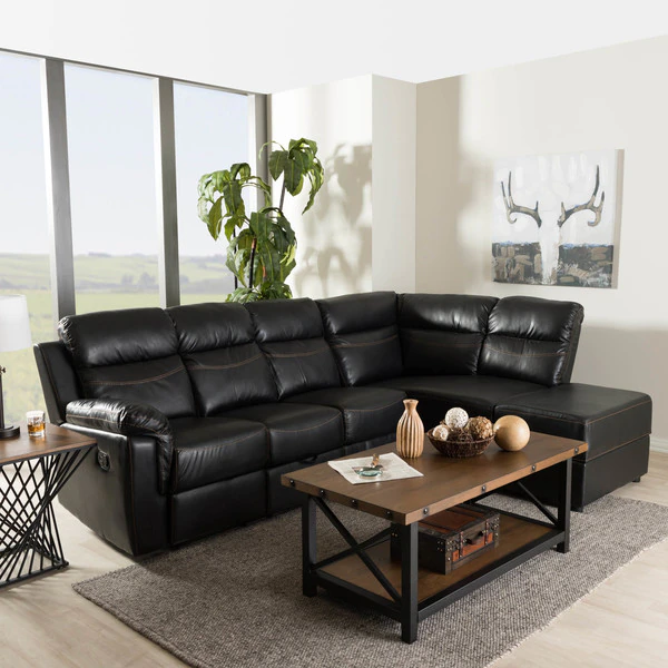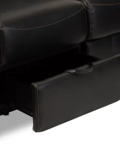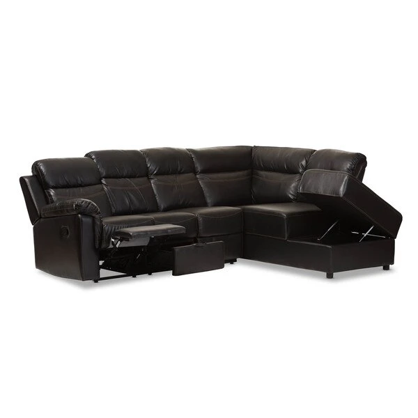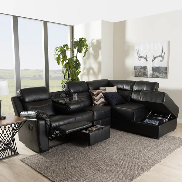 Ruggedly handsome style, softy-smooth comfort and luxurious surprises go hand in hand in this 2-piece sectional. Set includes a loveseat with a recliner, a chair with foldable seat back and a stationary chair and a chaise with gas-lift storage. Crafted with pinewood and plywood and upholstered in black faux leather, it takes relaxation to another level. Featuring a drop table with two-cup holders and a built-in pocket upon folding the chair back, this allows proper storage for your drinks, snacks and controllers upon your show time seating in the recliner chair next to it. Additional storage drawer is available in the same chair. Chaise features a gas-lift storage to hide your past-season magazines and reading materials. The Roland is constructed with webbing and is filled with high density foam to provide you with the ultimate relaxation. The Roland requires assembly.