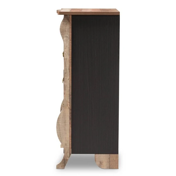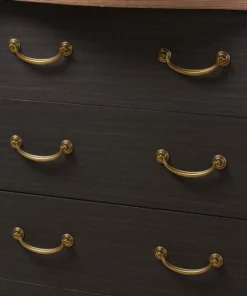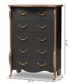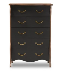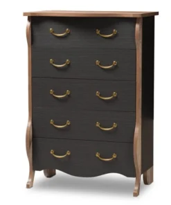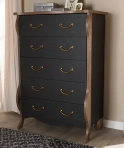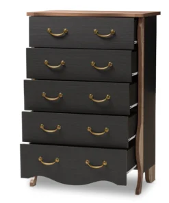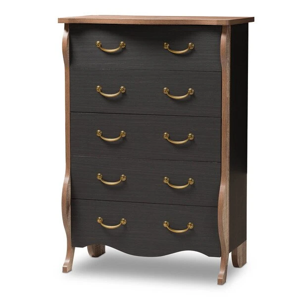 The Romilly 5-drawer chest is an exciting spin on a traditional look. The classic and traditional-inspired design is evident in the serpentine curves of the frame and attention to detail. The two-tone finish is where the updated look of this chest comes in. The sides and drawers of the chest are finished in black, contrasting and complementing the oak finish of the wings and top of the chest. All five drawers of the Romilly easily pull out on rolling slides. The chest features charming gold-finished metal drawer pulls with ornate grooves for extra detail. The Romilly is dynamic and can be coordinated with a wide range of decor, from romantic, rustic and French styles all the way through contemporary. Add this versatile charm to your bed room, guest room, nursery, or any space needing storage and style. The Romilly requires assembly.