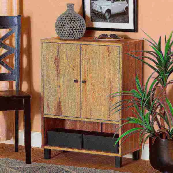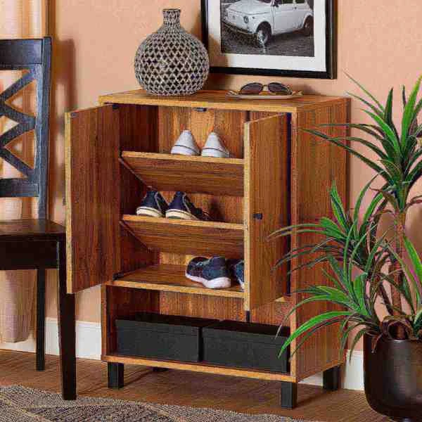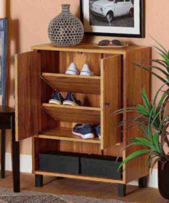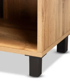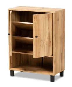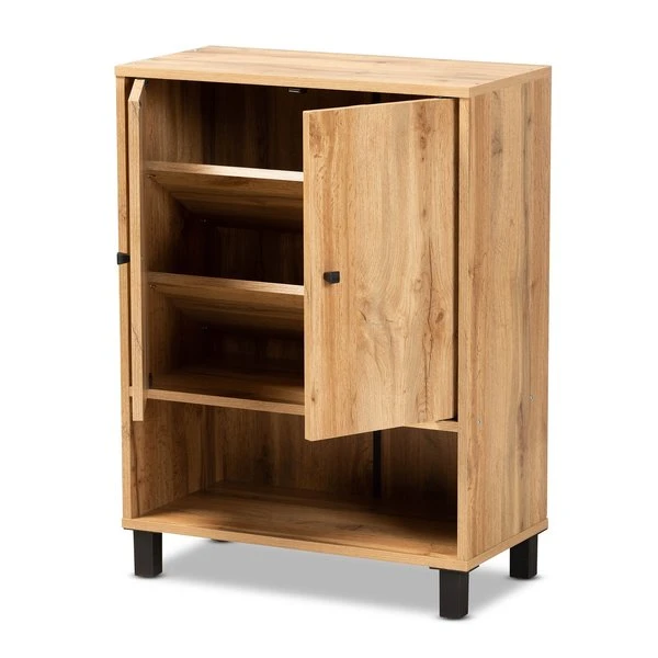 Keep your entryway free of shoe clutter with the Rossin shoe cabinet. Made in Malaysia, the Rossin is comprised of a sturdy wood frame showcasing a warm oak finish. Two doors conceal three shelves with storage space for up to eight pairs of shoes. Additional shoe storage is provided by an open shelf on the bottom of the cabinet. Requiring assembly, the Rossin features circular cut-outs on its back to enable air circulation and prevent mold growth on shoes. Black finished polymer legs and door knobs complete the look, making the Rossin shoe cabinet an excellent addition to the modern home.