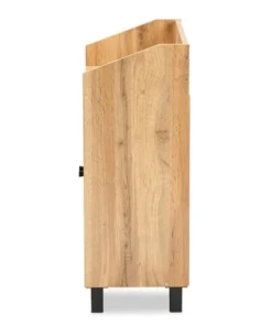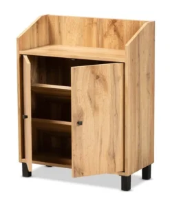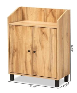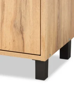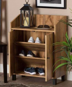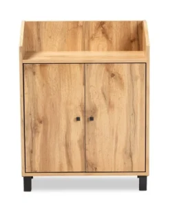 Keep your entryway free of shoe clutter with the Rossin shoe cabinet. Made in Malaysia, the Rossin is comprised of a sturdy wood frame showcasing a warm oak finish. Two doors conceal three shelves with storage space for up to eight pairs of shoes. Additional shoe storage is provided by an open shelf on top of the cabinet. Requiring assembly, the Rossin features circular cut-outs on its back to enable air circulation and prevent mold growth on shoes. Black finished polymer legs and door knobs complete the look, making the Rossin shoe cabinet an excellent addition to the modern home.