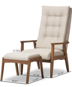 Inspired by the Danish designs, this stylish lounge chair and ottoman set uses solid rubberwood frame in dark walnut finishing to create a mid-century lounge chair set that will add to any mid-century decor. The little details are what makes the accent chair set special. The seat back is accented with buttons for classic aesthetic and is double-cushioned to promote ultimate relaxation. The splayed legs add a retro modern touch to this piece of clean lines furniture while the beige fabric upholstery and dark walnut wood create great contrast to go with any living space. Featuring light weight and easy handling, the Roxy will be suitable for those urban dwellers with limited space. It could be a cool-looking reading nook within 30 minutes of assembly out of a box. The Roxy leisure chair and the footstool set will be a standout piece in any modern interior.