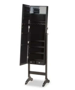 The sleek, modern design of the Ryoko armoire provides an elegant solution to jewelry organization. Made in China, this jewelry armoire is crafted from sturdy wood. The front is fitted with an adjustable full-length mirror that opens to reveal necklace and bracelet holders, ring compression folds, slots for both dangling and studded earrings, and one hanger rod. Requiring assembly, the interior of the Ryoko features two drawers and three shelves for additional storage. A simple yet worthwhile addition, the Ryoko jewelry armoire transforms your daily routine.