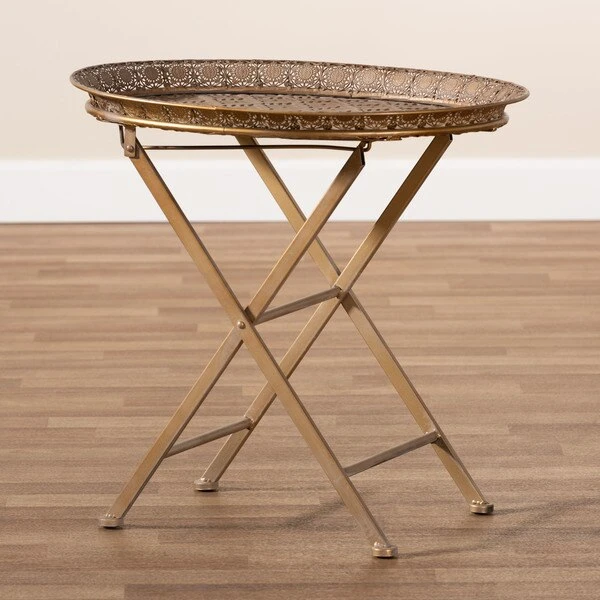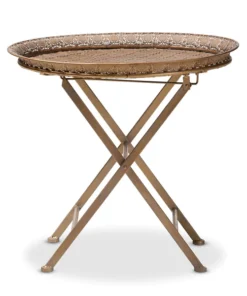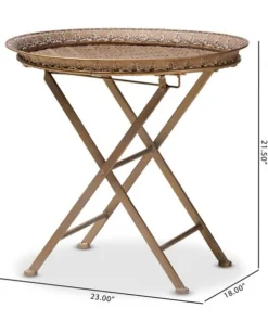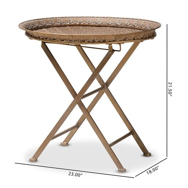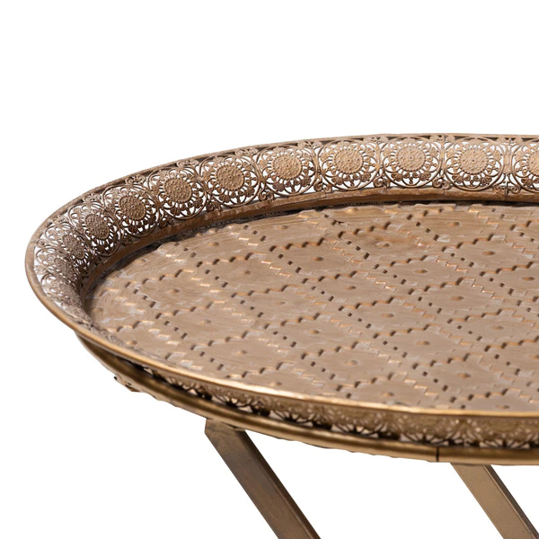 Inspired by the stunning artisan tables of Morocco, the Sabah tray table is a captivating addition to any interior. This metal table features a large, circular tray-style top embossed with a striking floral motif, ideal for serving tea or displaying decor. The tray is supported by a foldable base, providing a quick and easy storage solution when not in use. Its antique gold-tone finish provides an old-world charm. Ornamental and functional, this table can be used as a nightstand in the bedroom or as an accent table in the living room. The Sabah tray table requires assembly.