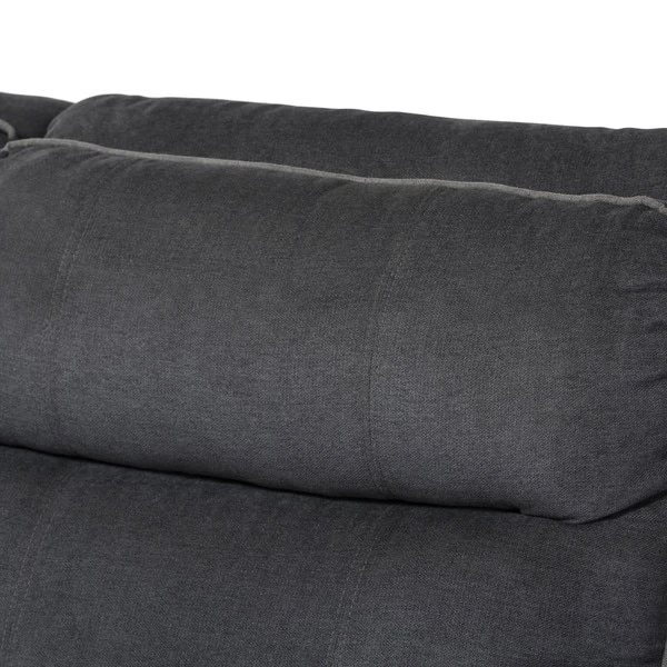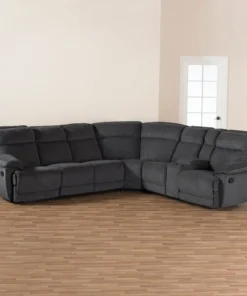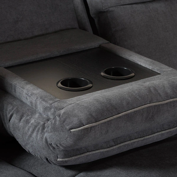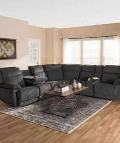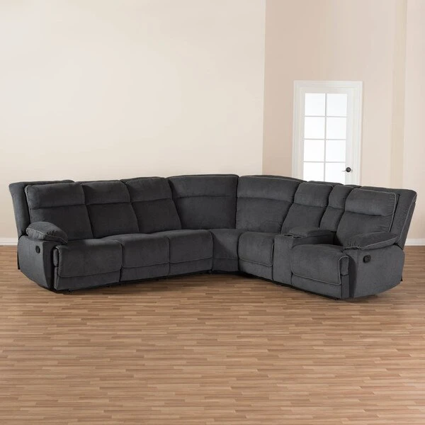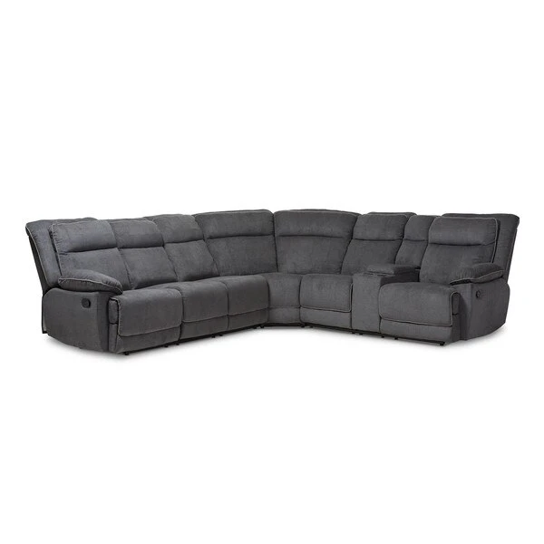 Transform your living area into the ultimate game day paradise with the Sabella two-tone fabric 7-piece reclining sectional. With its pillow top arms and generously padded seat and back, you'll be ready to relax all afternoon! For a major style impact, the sectional features fabric upholstery in dark grey and light grey piping as an outline, showcasing an updated look. Plastic handles on the side of the recliners release the footrests for your ultimate relaxation while the consoles providing the convenience within reach for your cups of drinks watching your favorite shows. Each piece connects to each other with built-in hinges.