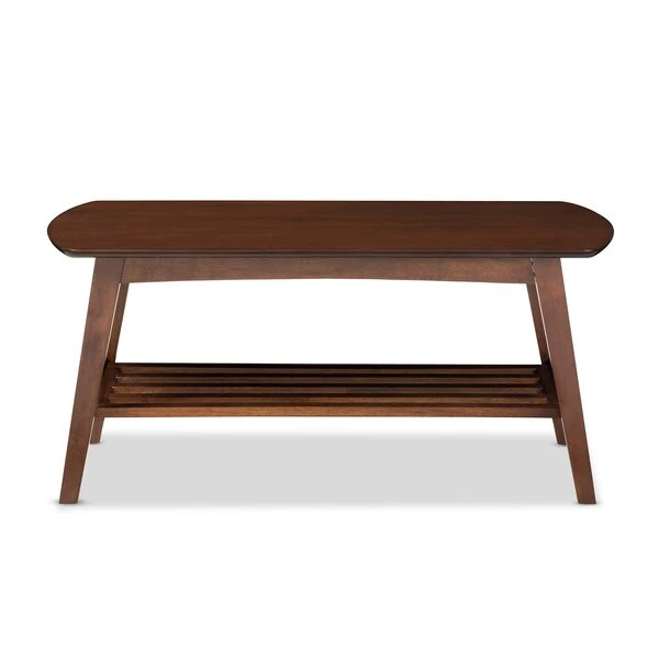 Bold curves, angled legs and dark stained walnut finishing make the Sacramento Coffee Table an eye-catching addition to any home. The slatted open shelf is a striking design feature as well as a roomy compartment for magazines or remote controls. The solid rubberwood and walnut veneer make for a tactile, luxury finish, while clear lacquer brings out the minimalist beauty of a mid-century inspired piece. The Sacramento coffee table doesn't end here. Get the conversation going around a matching end table and a console table to complete the look. The table requires assembly.