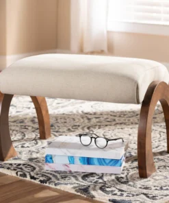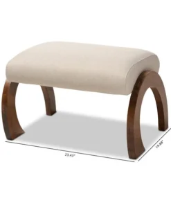 Add some excitement to your space with the Sandrine ottoman. The modern and contemporary-inspired design comes through in its solid coloring and unique silhouette. The Sandrine features curved, arched legs in an energetic, swooping design. The legs are walnut-finished solid rubberwood, giving this ottoman lasting stability. The seat of the Sandrine is foam-padded and upholstered in light beige fabric. This ottoman will be a great conversation starter and statement piece for use in your livingroom, entryway, or other shared spaces. The Sandrine requires assembly.