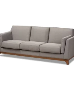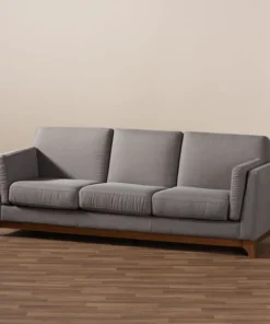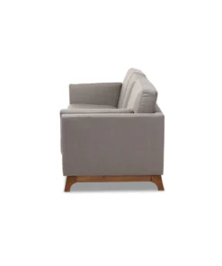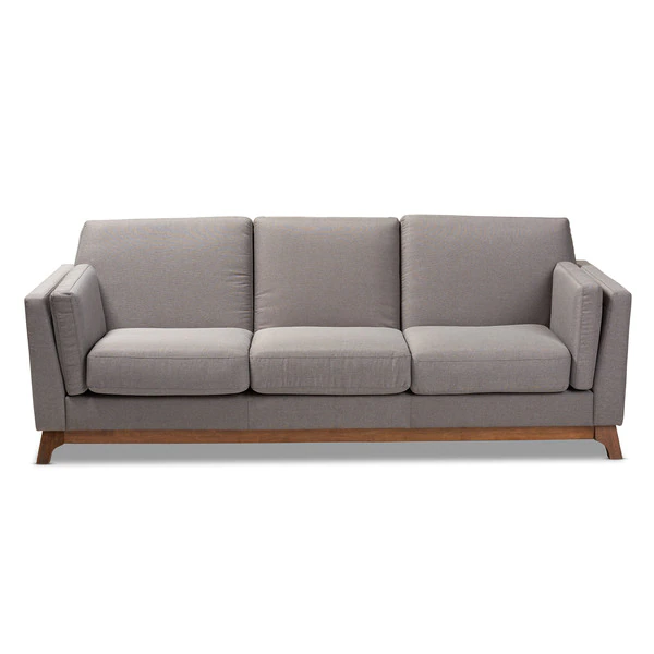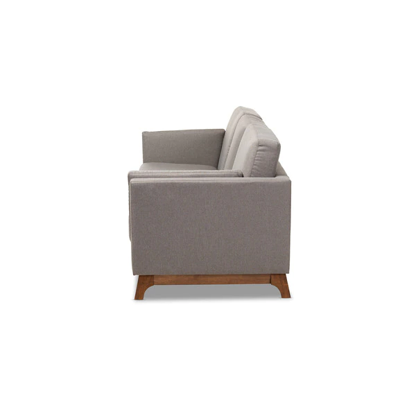 Create a stylish mid-century modern atmosphere in your living room with the Sava 3-seater sofa. The Sava is constructed from solid rubberwood for durability and showcases a rich walnut finish. Plush foam-padding provides comfortable seating, while grey polyester fabric upholstery allows for easy maintenance. Featuring elements of mid-century modern design, the sofa displays smooth track arms and angled legs. Add a few accent pillows and a knitted throw blanket to complete the look. The Sava 3-seater sofa requires assembly.